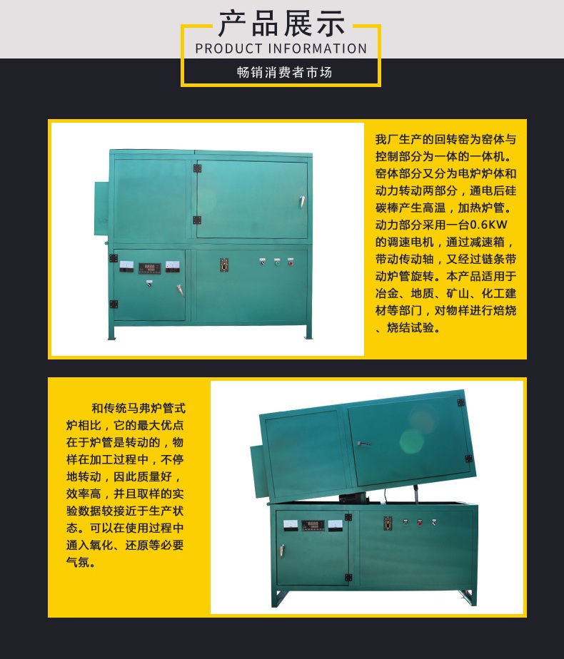 本產(chǎn)品適用于冶金、地質(zhì)、礦山、化工建材等部門,對物樣進(jìn)行焙燒、燒結(jié)試驗。和傳統(tǒng)馬弗爐管式爐相比,它的最大優(yōu)點在于爐管是轉(zhuǎn)動的,物樣在加工過程中,不停地轉(zhuǎn)動,因此質(zhì)量好,效率高,并且取樣的實驗數(shù)據(jù)較接近于生產(chǎn)狀態(tài)。可以在使用過程中通入氧化、還原等必要氣氛。